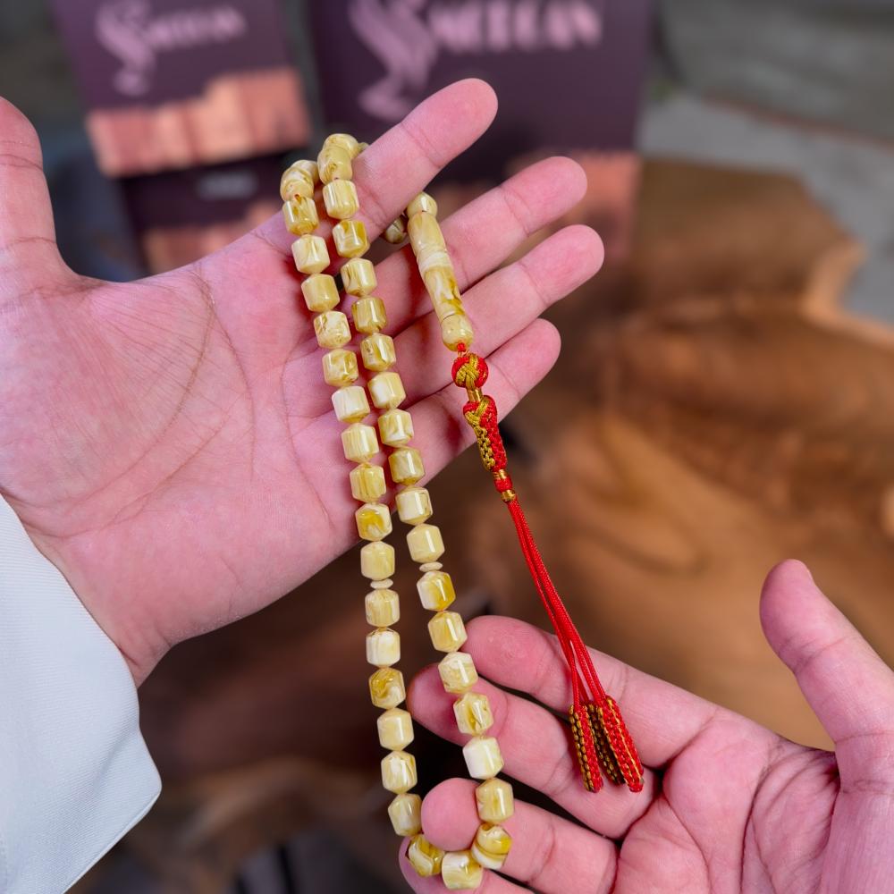 - يتميز المسباح بخرز مستكة طبيعي يمنح ملمسًا ناعمًا وإحساسًا مريحًا أثناء التسبيح.