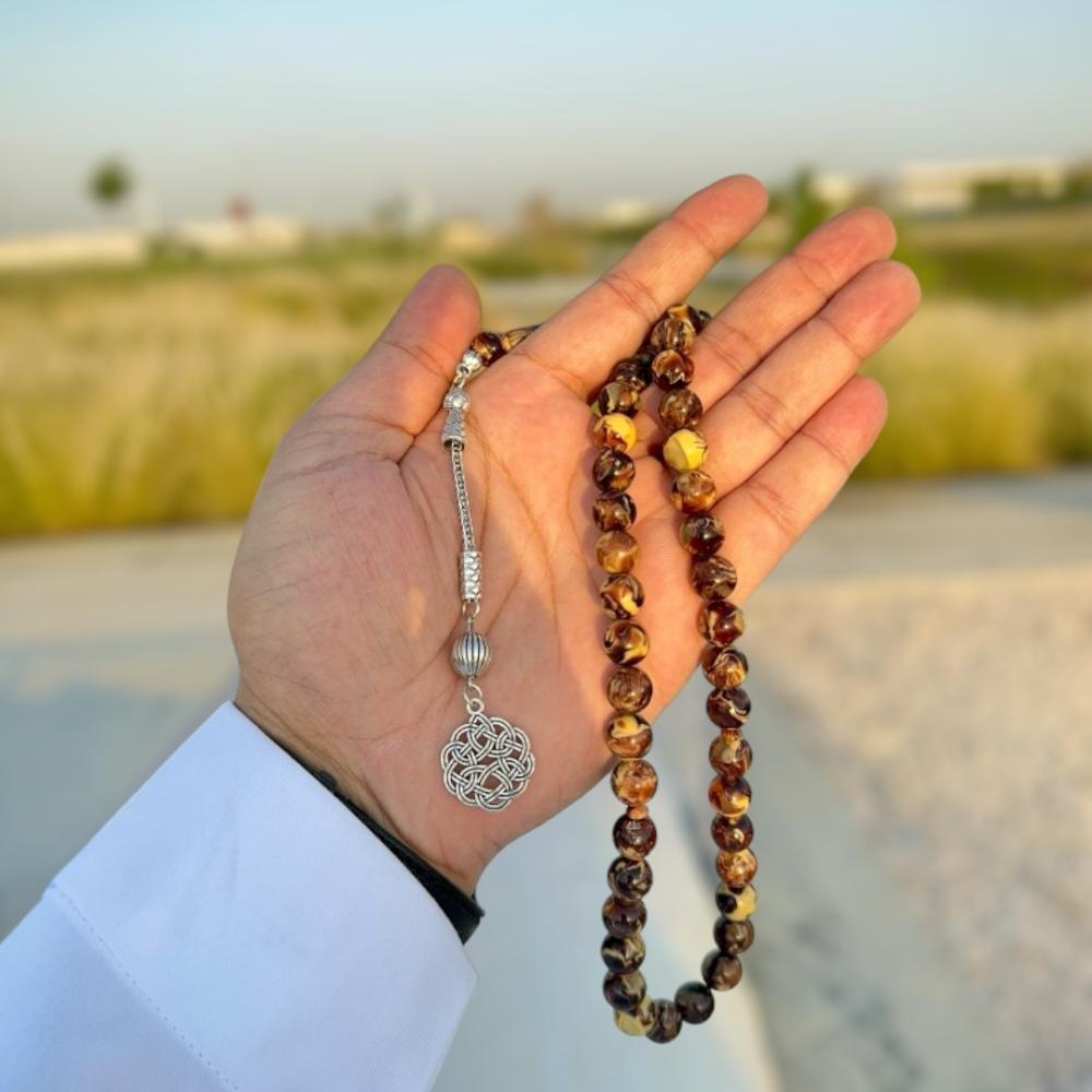 الخامة مايسمى بالبكلايت خفيفة الوزن مصممة للاستخدام اليومي، تتميز بتصميم مريح وأنيق، عليها طربزونه بشكل جميل مصنوعة يدوياً مما يعطي السبحة جمال وفخامة. طريقة تقديم مميزة جدا مناسبة للإهداء
