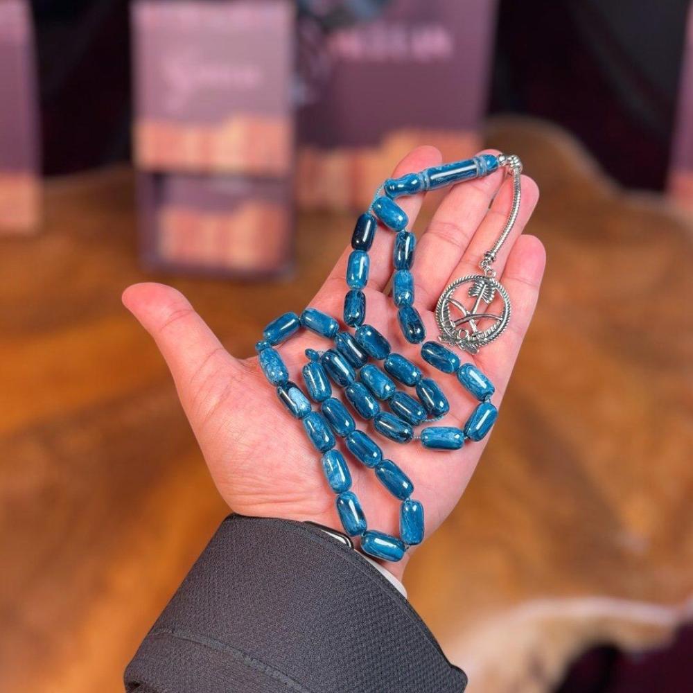 الخامة مايسمى بالبكلايت خفيفة الوزن مصممة للاستخدام اليومي، تتميز بتصميم مريح وأنيق، عليها طربزونه بشكل جميل مصنوعة يدوياً مما يعطي السبحة جمال وفخامة. طريقة تقديم مميزة جدا مناسبة للإهداء