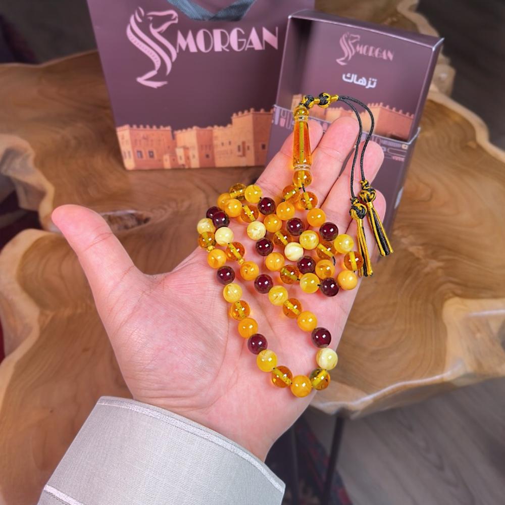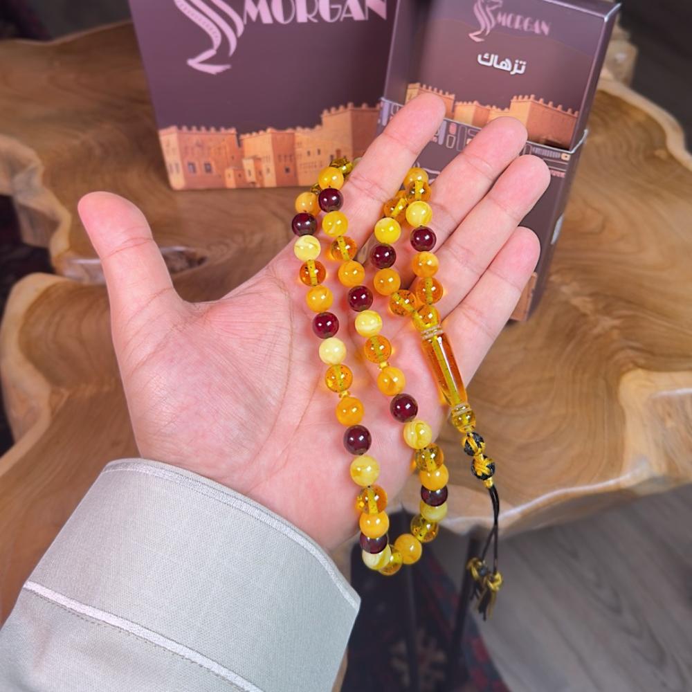 حينما يتم تقطيع حجر الكهرمان الطبيعي لعمل مسباح الكهرمان ينتج غبار من التقطيع او الخراطة ويأخذ هذا الغبار او ما يسمى تراب الكهرمان يخلط بمواد ثم يصنع مرة اخرى منه مسباح ويسمى مسباح تراب الكهرمان