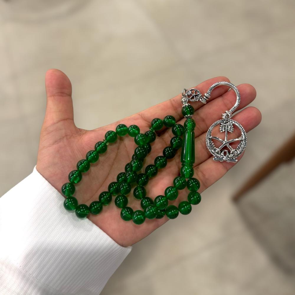 مسباح اخضر أنيق مصنوع من مادة البكلايت الفاخرة، يتميز بحفر شعار المملكة ليعكس الطابع التراثي السعودي بتصميم راقٍ وجذاب. مثالي للاستخدام الشخصي أو كهدية مميزة.