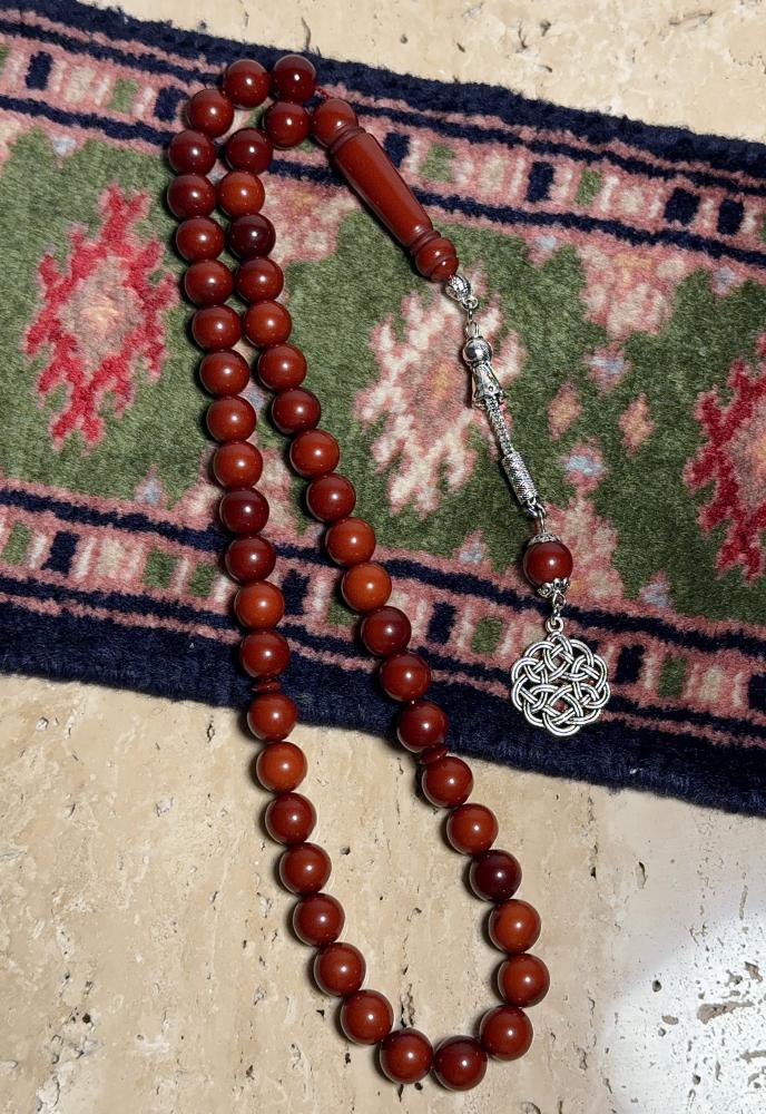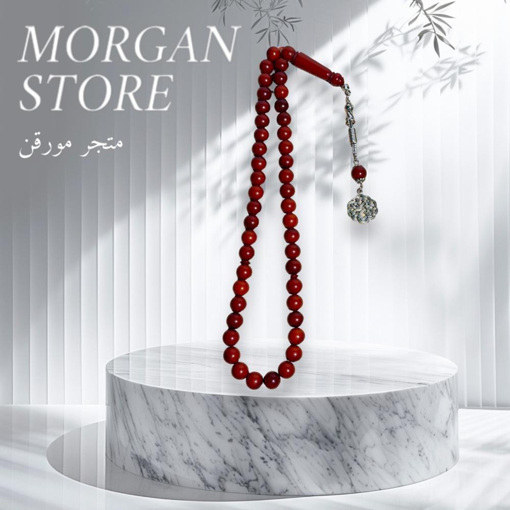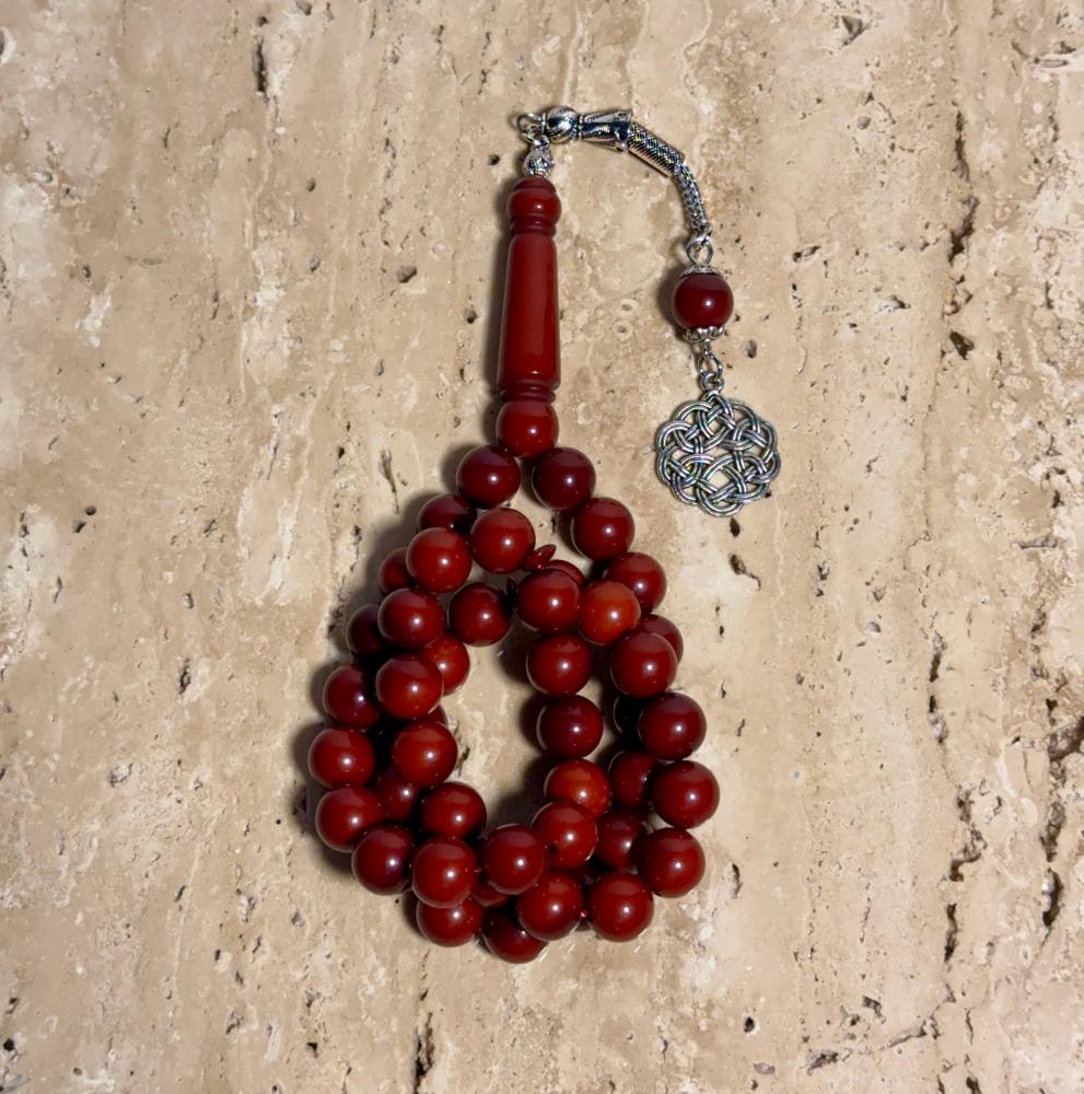 الخامة مايسمى بالبكلايت خفيفة الوزن مصممة للاستخدام اليومي، تتميز بتصميم مريح وأنيق، عليها طربزونه بشكل جميل مصنوعة يدوياً مما يعطي السبحة جمال وفخامة. طريقة تقديم مميزة جدا مناسبة للإهداء