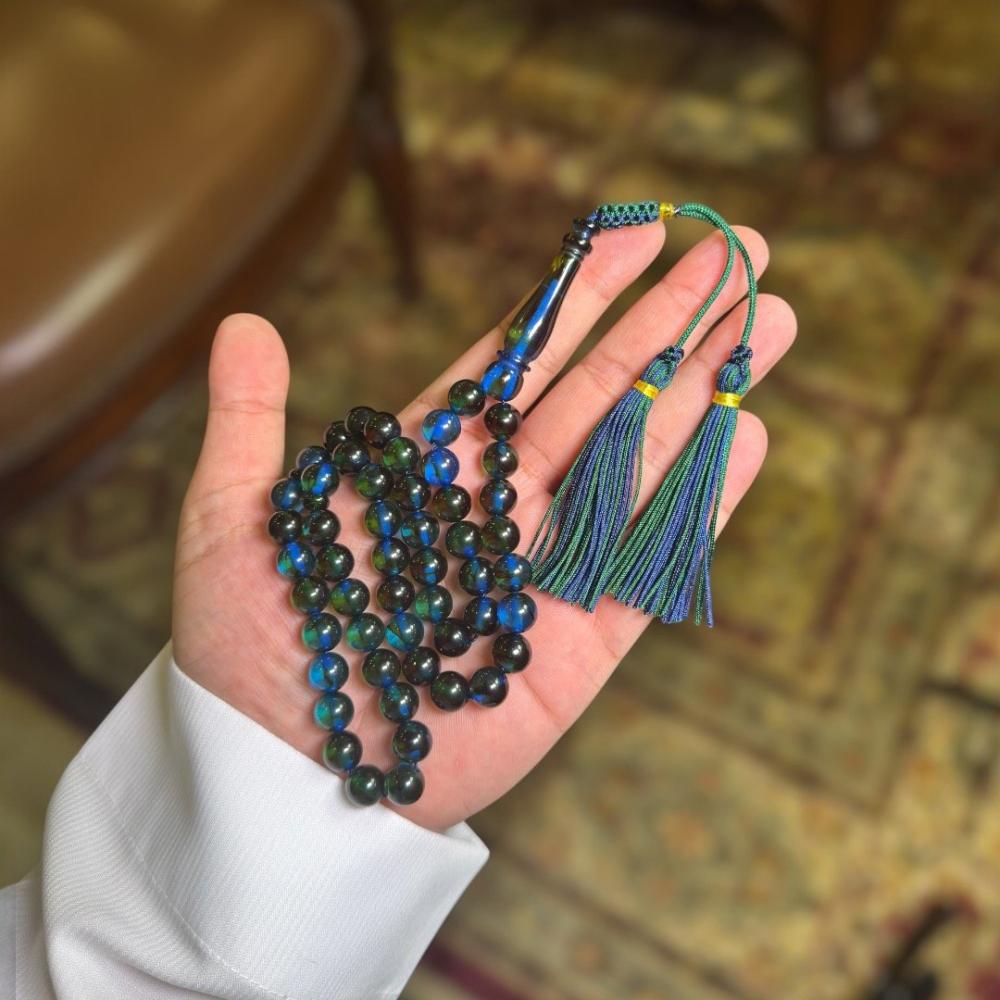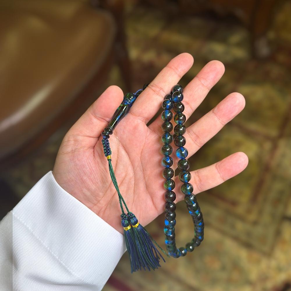 الخامة مايسمى بالبكلايت خفيفة الوزن مصممة للاستخدام اليومي، تتميز بتصميم مريح وأنيق، عليها طربزونه بشكل جميل مصنوعة يدوياً مما يعطي السبحة جمال وفخامة. طريقة تقديم مميزة جدا مناسبة للإهداء